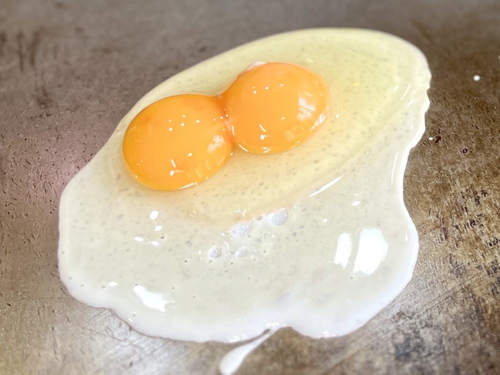 ふたごの卵、二黄卵っていうんですけど、普通の卵よりも大きくて、食感もふわふわしてるんです。