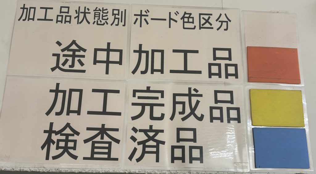 途中加工品・加工完成品・検査済み品を、色分けしたボードで区別し、工程の混在や誤認も、ここで防いでいます。